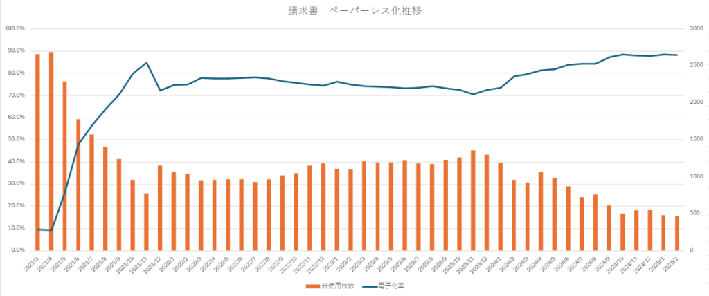 私たちはペーパーレス化の推進のために、請求書・契約書・給与明細のデジタルツールを活用しています。電子メールや電子請求書発行システムに置き換えることで、2000枚以上の紙使用量削減を実現しています。